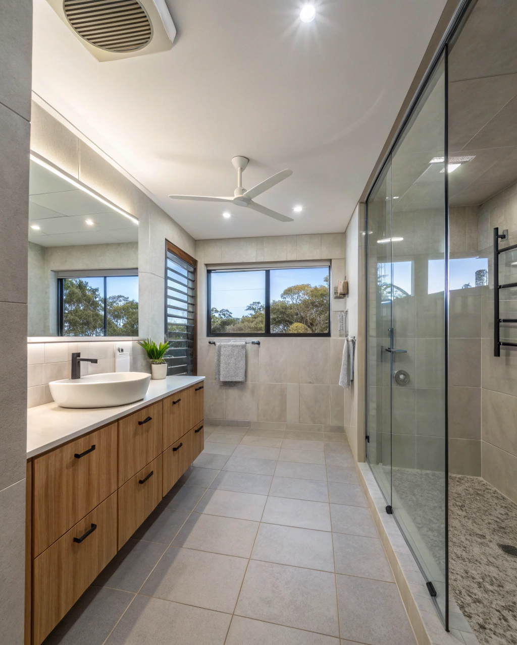 - Timber-look tiles with texture — warm aesthetic with proper wet area ratings